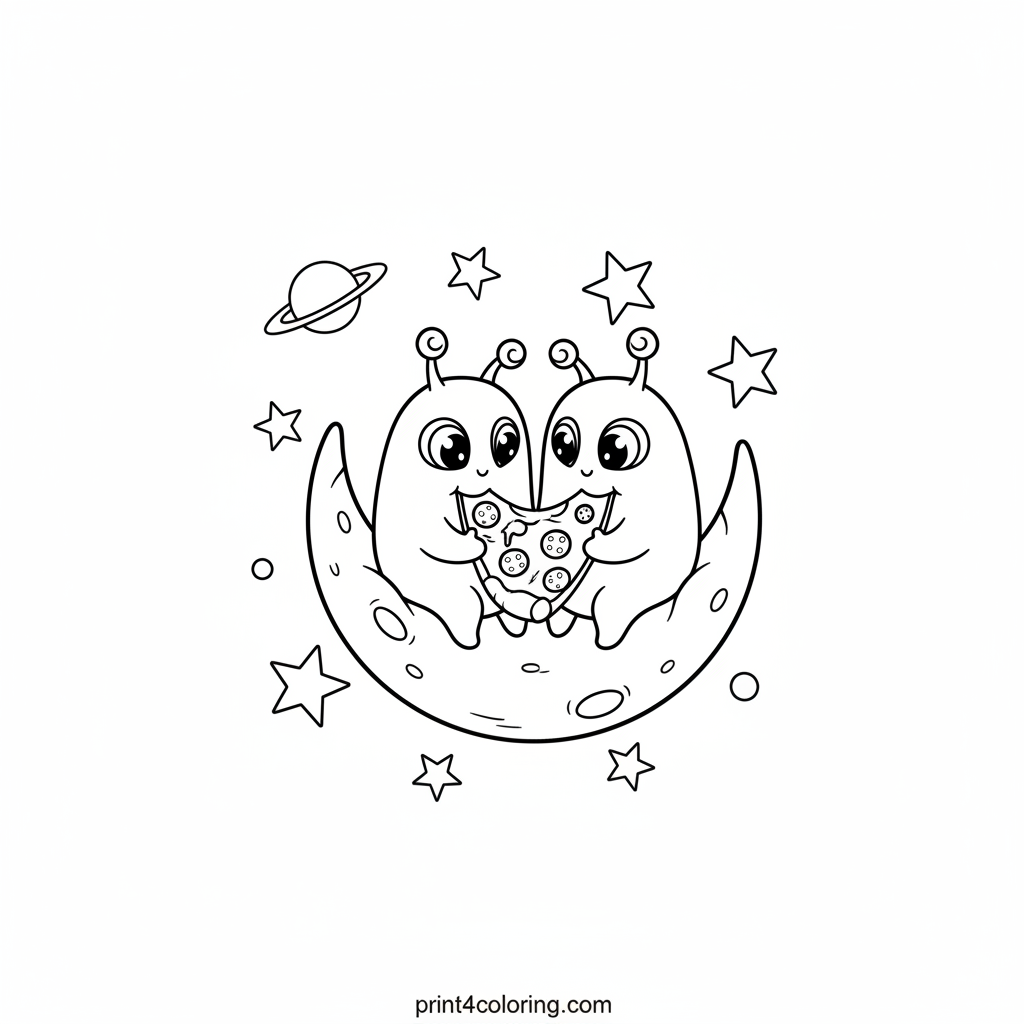 Join two adorable alien friends as they enjoy the ultimate cosmic feast! Perched on a cozy crescent moon, they happily share a giant slice of pizza, surrounded by twinkling stars and distant, colorful planets. This scene is out of this world, perfect for a fun coloring adventure!