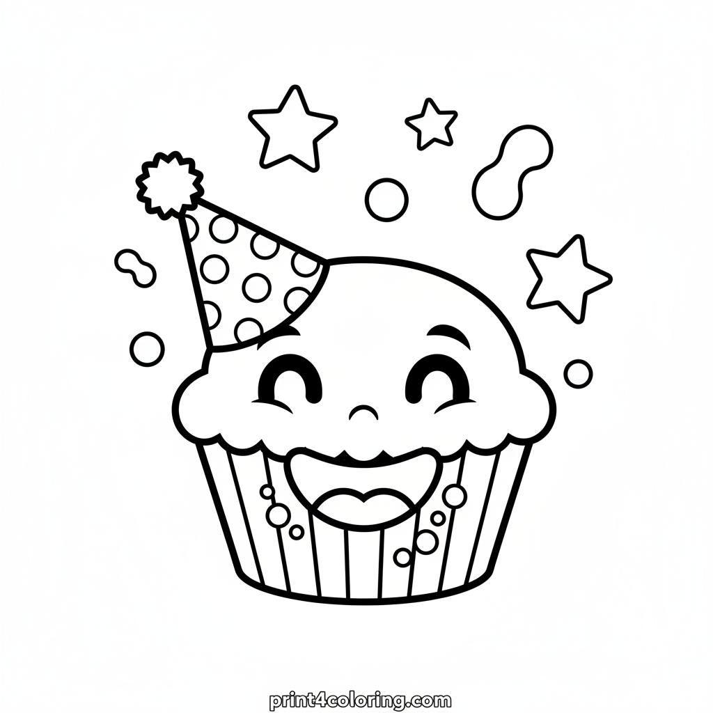 Get ready to color a super sweet and silly scene! This adorable cupcake is giggling away, wearing a tiny, oversized party hat tilted playfully. Confetti rains down all around, making it a festive party! Grab your brightest colors and bring this happy dessert to life, making every sprinkle and detail pop with joy.
