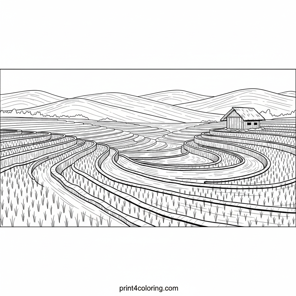 Golden Harvest Glow: Sunny Rice Terraces Coloring Page