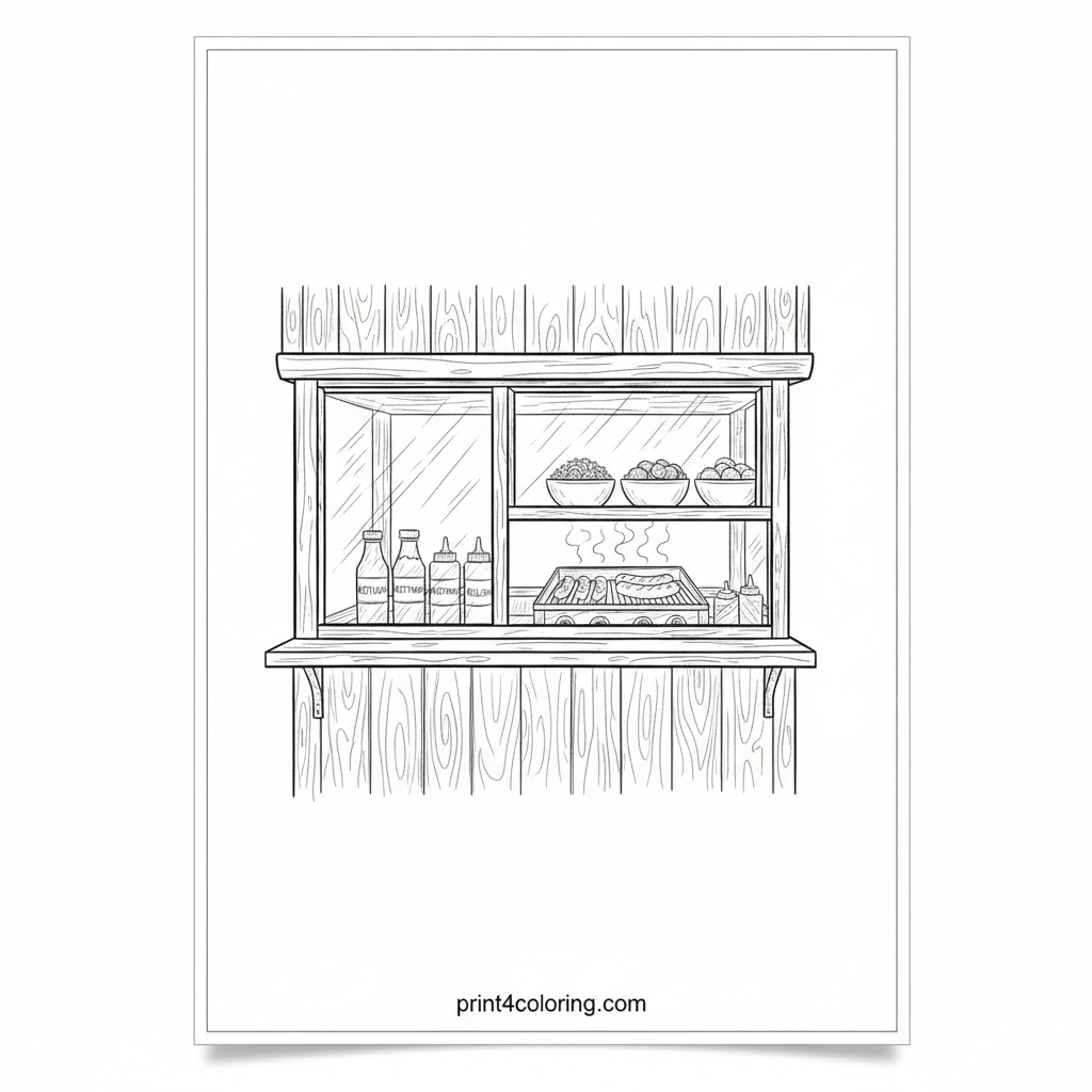 Step into a bustling scene with this expert coloring page featuring a vintage hotdog stand! Discover intricate details of textured wood, gleaming metal, and clear glass. Imagine the steam rising from the grill and perfectly arranged condiments just waiting for your artistic touch. A delicious challenge for advanced colorists!