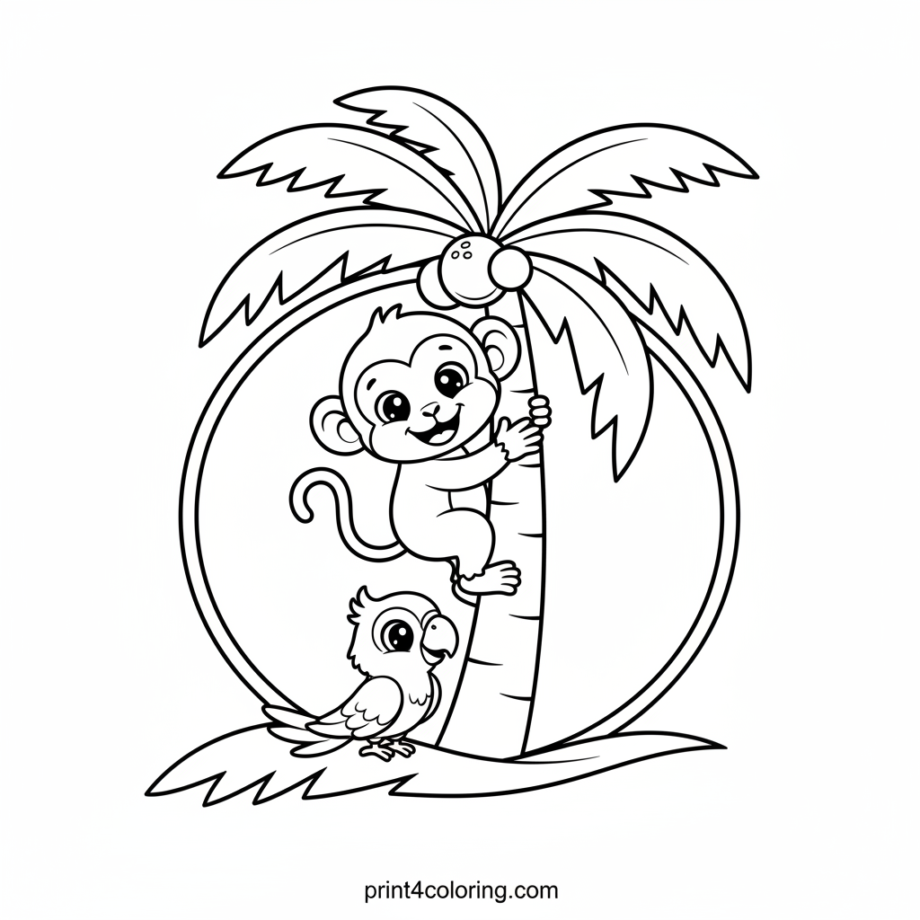 A cute, mischievous monkey with a big grin is carefully climbing a tall palm tree, reaching for a round coconut. Below, a happy, colorful parrot watches the fun adventure from a leafy branch. This cozy tropical scene is perfect for little hands to color!