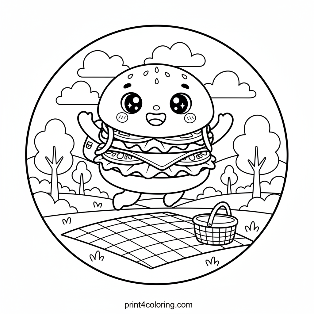 #burger#picnic#food#cartoon#happy#park#adventure#summer#cute#coloring-page#printable