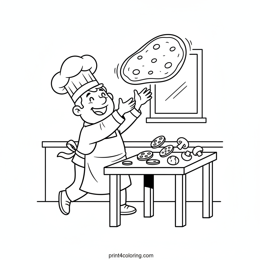 Join our cheerful, round-faced chef as they happily toss a giant pizza dough high into the air! This fun scene features a table laden with simple, big shapes of yummy ingredients like pepperoni and mushrooms, ready for your colorful touch. Get ready to create a delicious masterpiece!