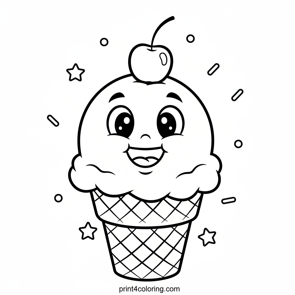 Get ready for a sweet coloring adventure! This giant, friendly ice cream scoop is smiling just for you, wearing a cute cherry hat. It's perfectly balanced on a crunchy waffle cone, surrounded by playful sprinkles and twinkling stars. Bring this delightful dessert to life with your favorite colors and make it extra yummy!