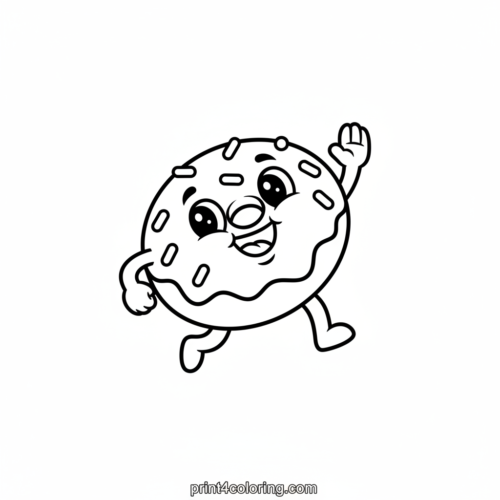 Meet our cheerful donut friend, happily waving hello! This adorable treat features a sweet smile, big friendly eyes, and a tiny hand, all covered in colorful sprinkles. It's ready for you to bring it to life with your favorite hues on a simple background. Get ready for a sweet coloring adventure!