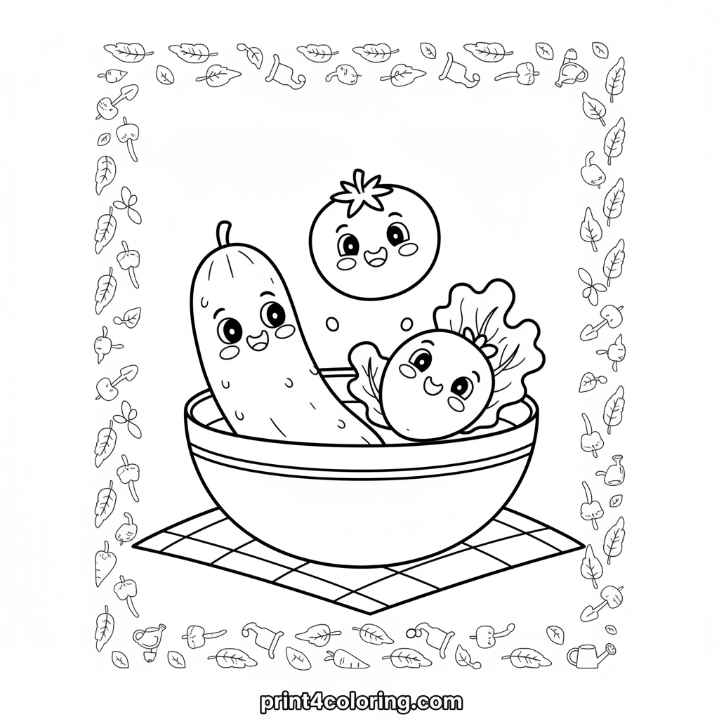 Come join the fun in a sunny garden where friendly vegetables are making a delicious salad! A smiling cucumber, happy tomato, and giggling lettuce leaf are gently gathering themselves into a big, welcoming bowl. Use your brightest colors to bring this healthy harvest scene to life!