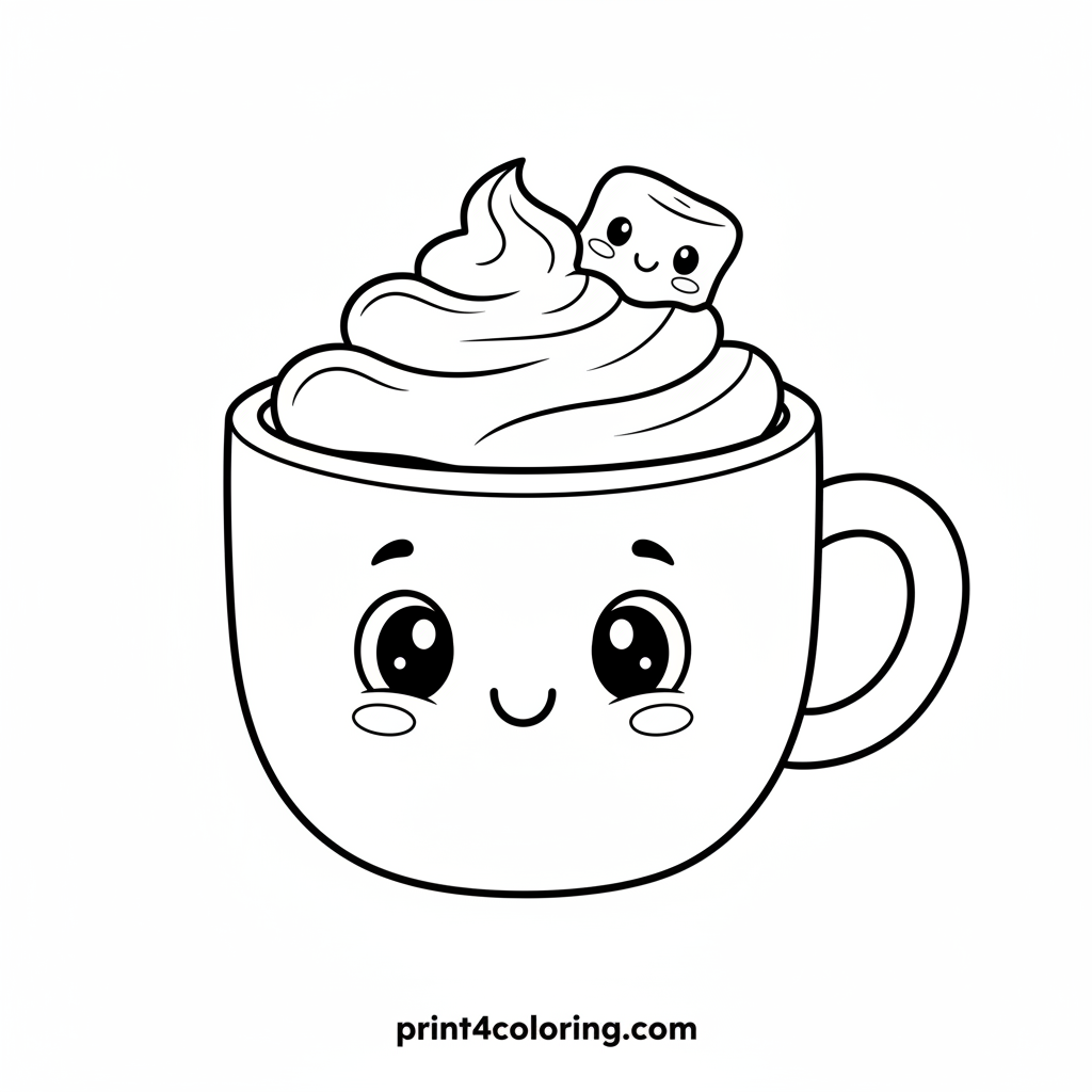 Get ready to color a super sweet and friendly hot chocolate mug! This cozy buddy has a big, happy smile and cute eyes. It's topped with a delicious swirl of whipped cream and a cheerful marshmallow. Imagine a warm, comfy scene perfect for a chilly day. Grab your crayons and bring this delightful drink to life!