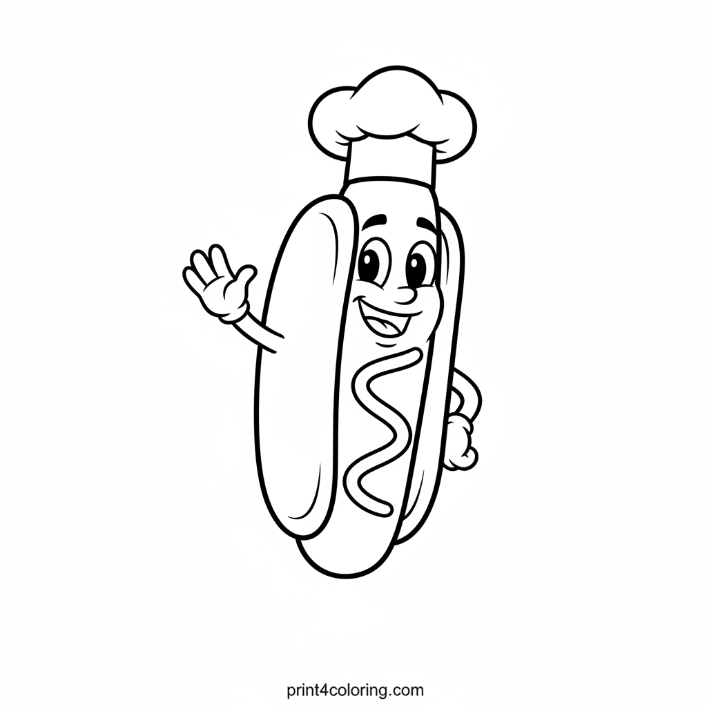 Meet our cheerful hotdog friend, ready to bring smiles! This delightful hotdog has big, happy eyes and a super wide grin, making everyone feel welcome. He's wearing a cute tiny chef's hat. Watch him wave a friendly hello, inviting you to add vibrant colors to his joyful portrait. A tasty coloring adventure awaits!