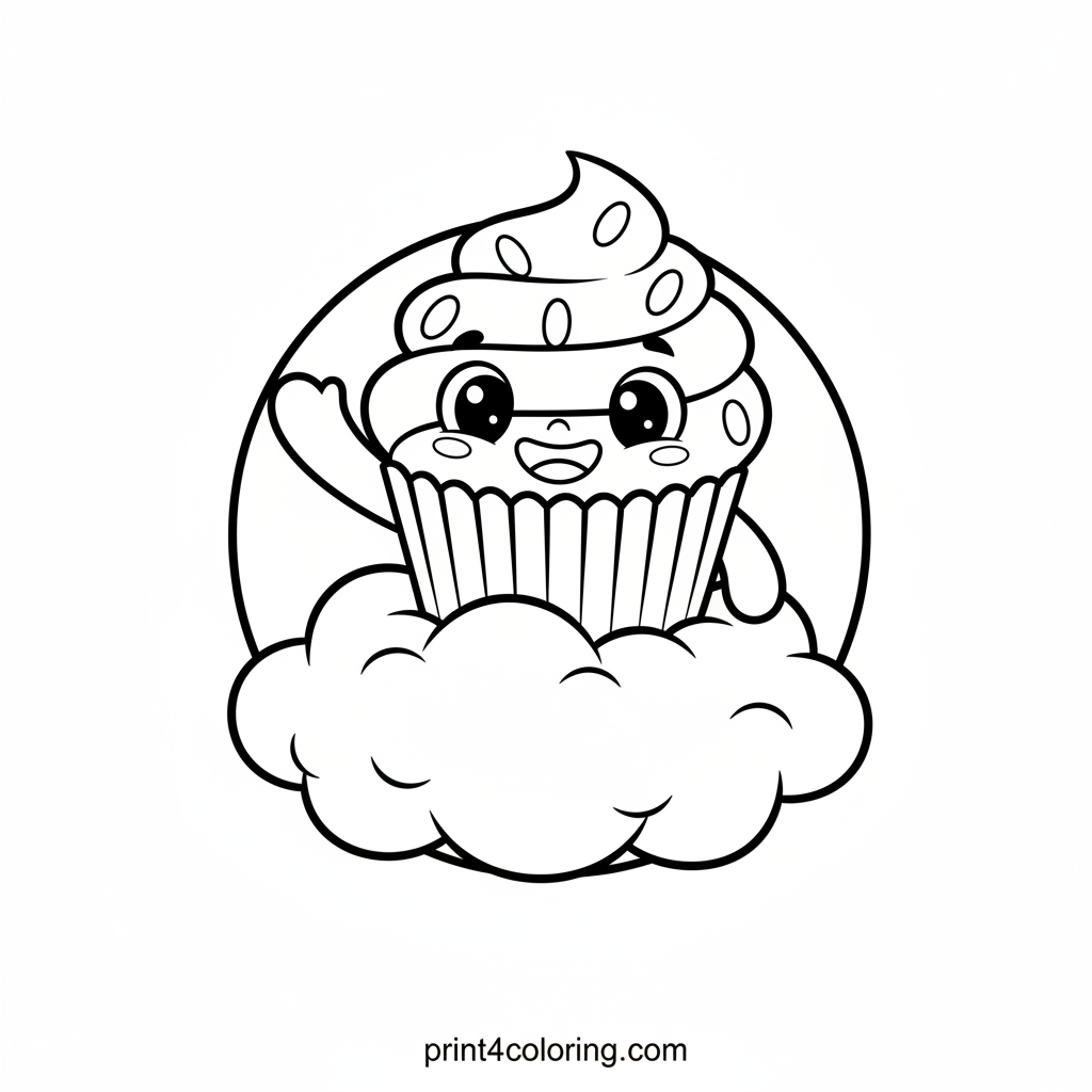 Meet our cheerful little cupcake friend, waving hello from a soft, fluffy cloud! This adorable dessert has a big, happy smile, two sparkling eyes, and a generous topping of colorful sprinkles. Get ready to add your favorite colors to this sweet scene and make this cozy cupcake even more delightful!