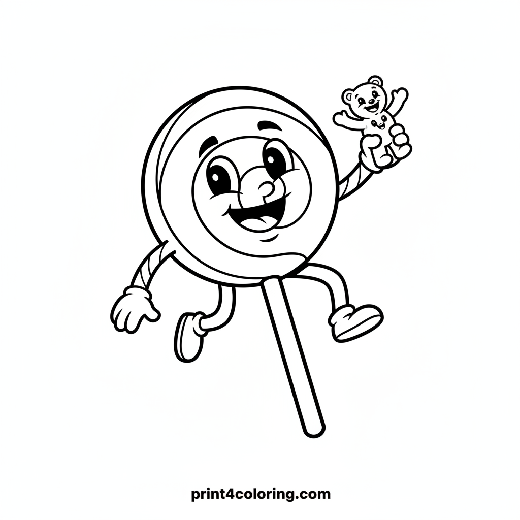 Meet your new sweet friends! A giant, happy lollipop with a big smile and friendly eyes is waving hello, gently holding a tiny, cheerful gummy bear in its candy hand. Both are excited to greet you! This delightful scene is perfect for a colorful adventure, inviting little artists to bring them to life.