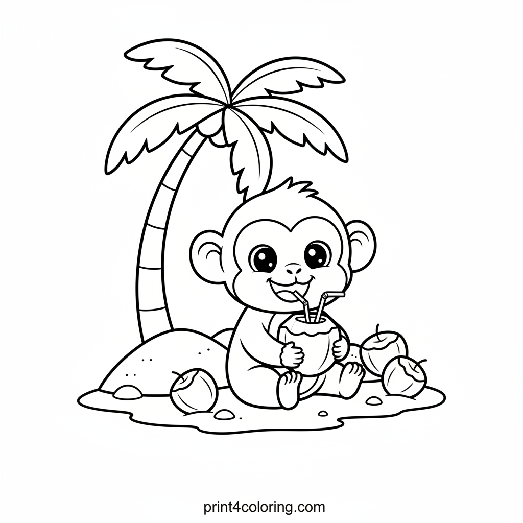 Join a delightful monkey with big, friendly eyes as it enjoys a refreshing coconut drink under a swaying palm tree. The warm sand is dotted with more coconuts, waiting to be discovered. This cozy scene invites you to add vibrant colors to a tropical paradise, bringing the monkey's happy moment to life!