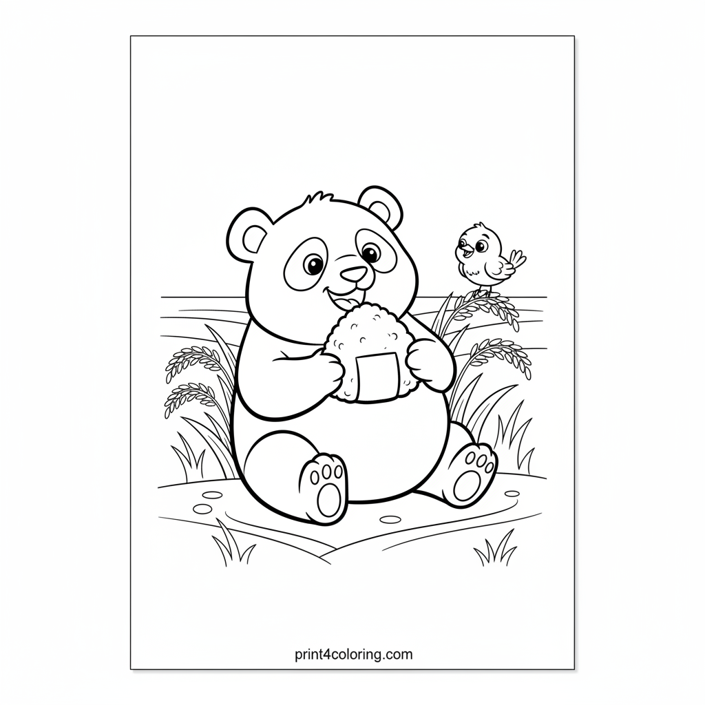 Join our happy panda for a delightful picnic in a lush green rice paddy! This cuddly bear is enjoying a giant rice ball, while a curious little bird watches from a nearby stalk. A peaceful scene perfect for bringing to life with your favorite colors. Imagine the vibrant greens and the panda's soft fur!