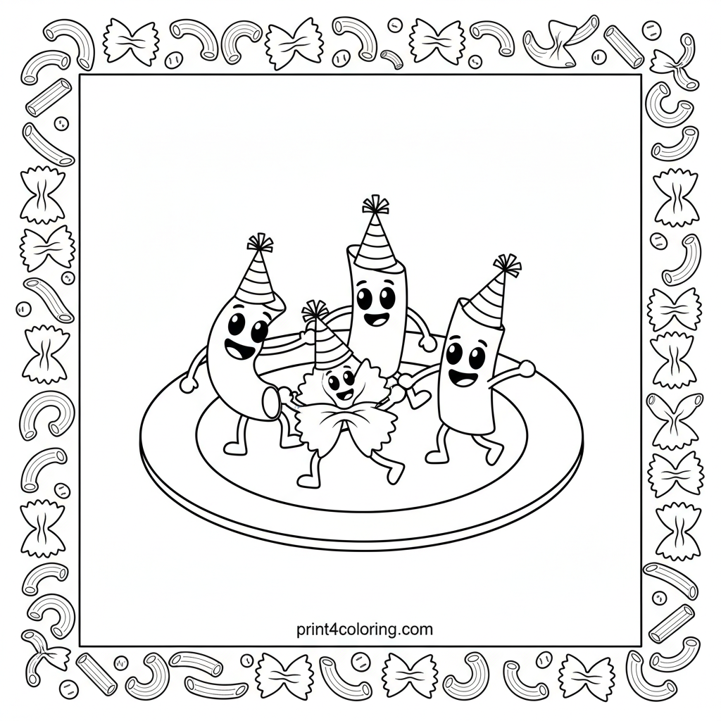 Join the most delightful dance party ever! Macaroni, penne, and farfalle pasta shapes are wearing tiny party hats, dancing happily on a giant plate. Use vibrant colors to make this scene burst with joy and flavor! A delicious celebration awaits.