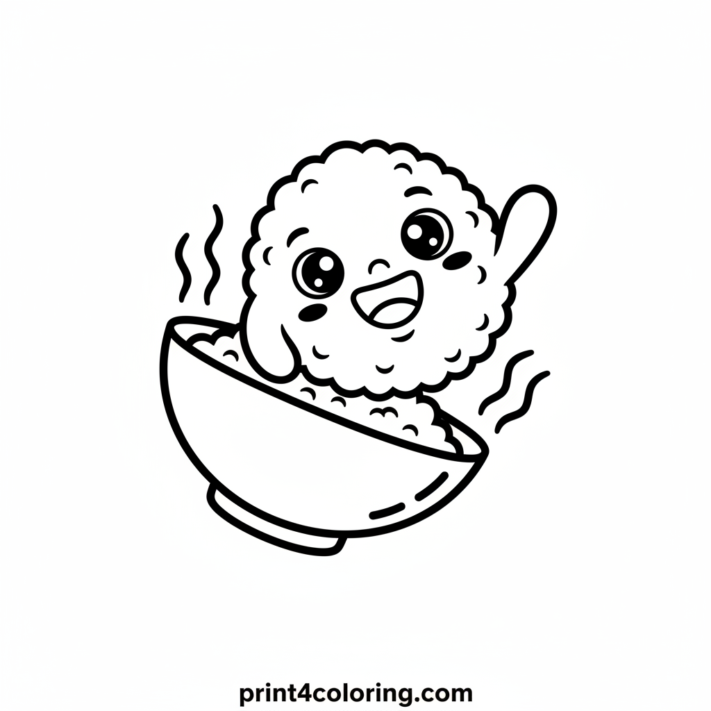 Get ready for a super cute coloring adventure! Meet our happy little rice grain, peeking out with big, friendly eyes and a cheerful smile. This adorable character is playing peek-a-boo from a warm, steaming bowl. Imagine the yummy steam and the cozy glow as you bring this delightful scene to vibrant life!