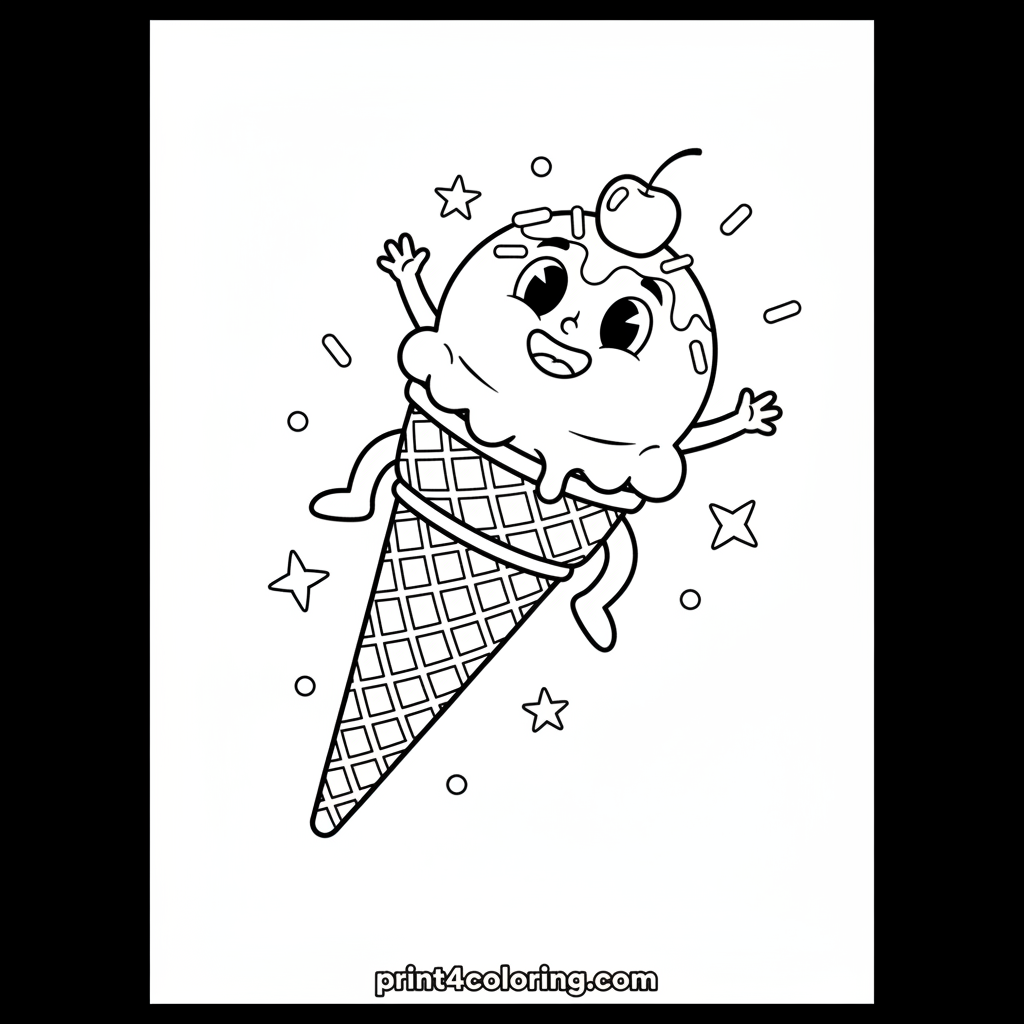 Imagine a giant, friendly scoop of ice cream, beaming with joy! This happy treat wears a cherry hat and sits proudly on a crispy waffle cone. Tiny sprinkles and sparkling stars float all around, making it a super sweet scene ready for your brightest colors. Get ready for a delicious coloring adventure!