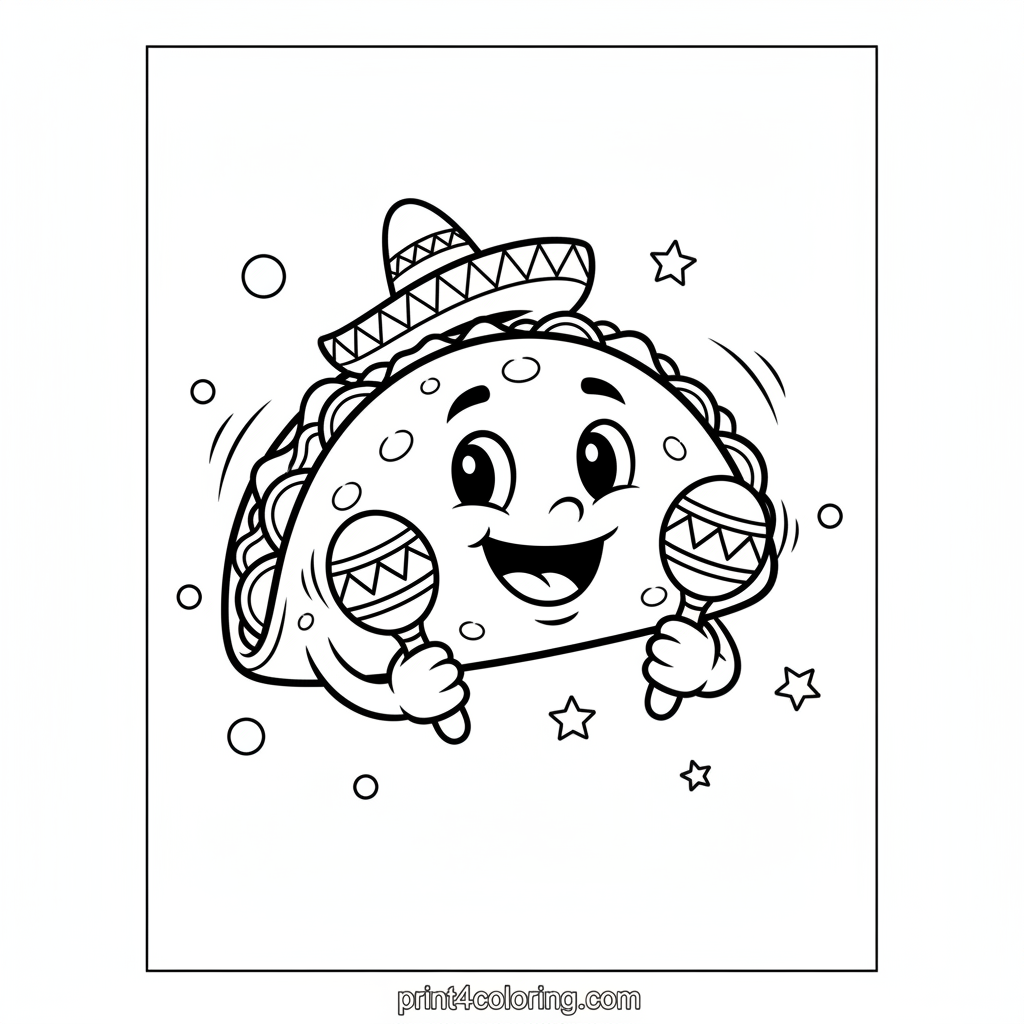 Get ready to fiesta with our happy taco friend! This cheerful character is all smiles, wearing a tiny sombrero and shaking maracas, dancing among gentle confetti. A delightful scene for young artists to bring to life with vibrant colors, celebrating fun and flavor!
