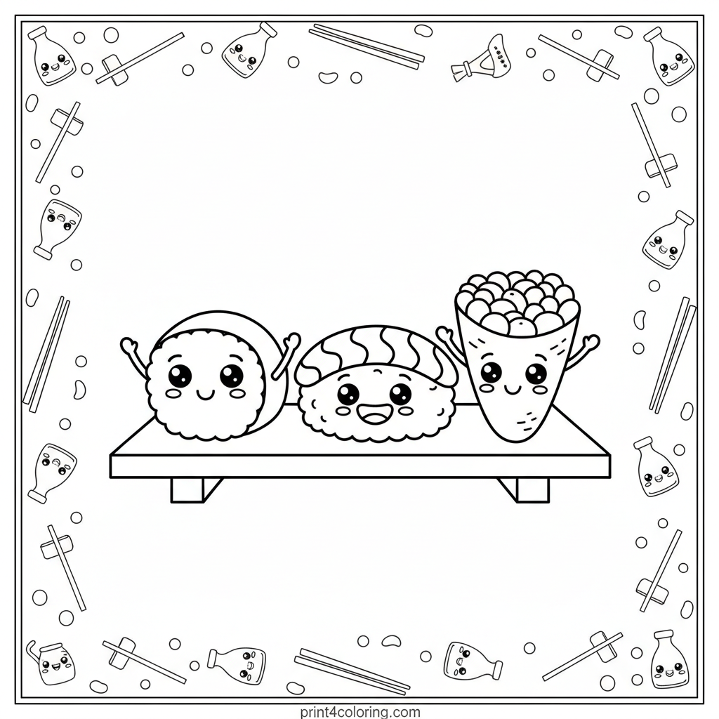 Meet the Happy Sushi Friends! This delightful coloring page features smiling sushi rolls—maki, nigiri, and temaki—with big, friendly eyes. They hold tiny hands, waving from a green seaweed mat. Ready for your vibrant colors, these cheerful pals invite you to a delicious adventure!