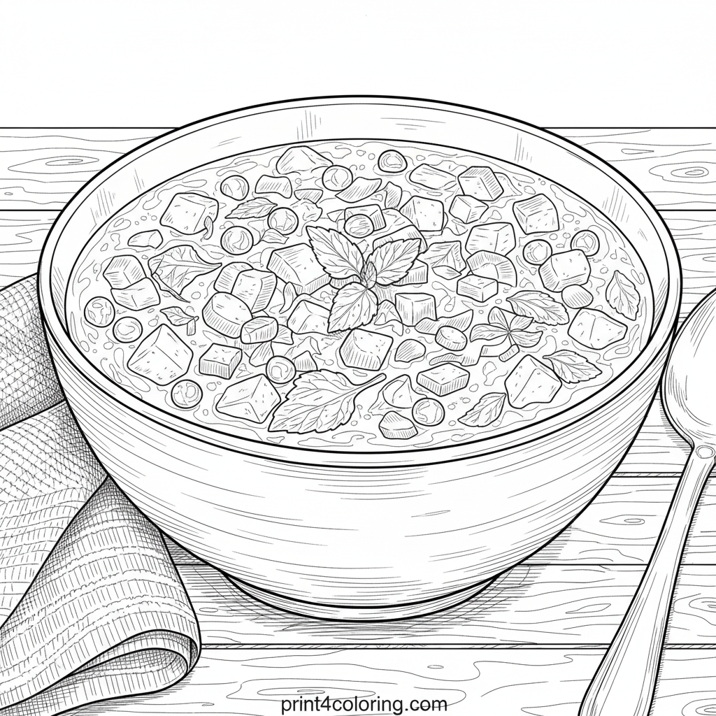 Dive into a cozy coloring adventure with this detailed still life! A steaming bowl of hearty vegetable soup, brimming with finely drawn carrots, peas, and potatoes, waits on a rustic wooden table. A fresh herb sprig adds a touch of green, alongside a soft linen napkin and a shiny spoon. Perfect for exploring textures and warm colors!