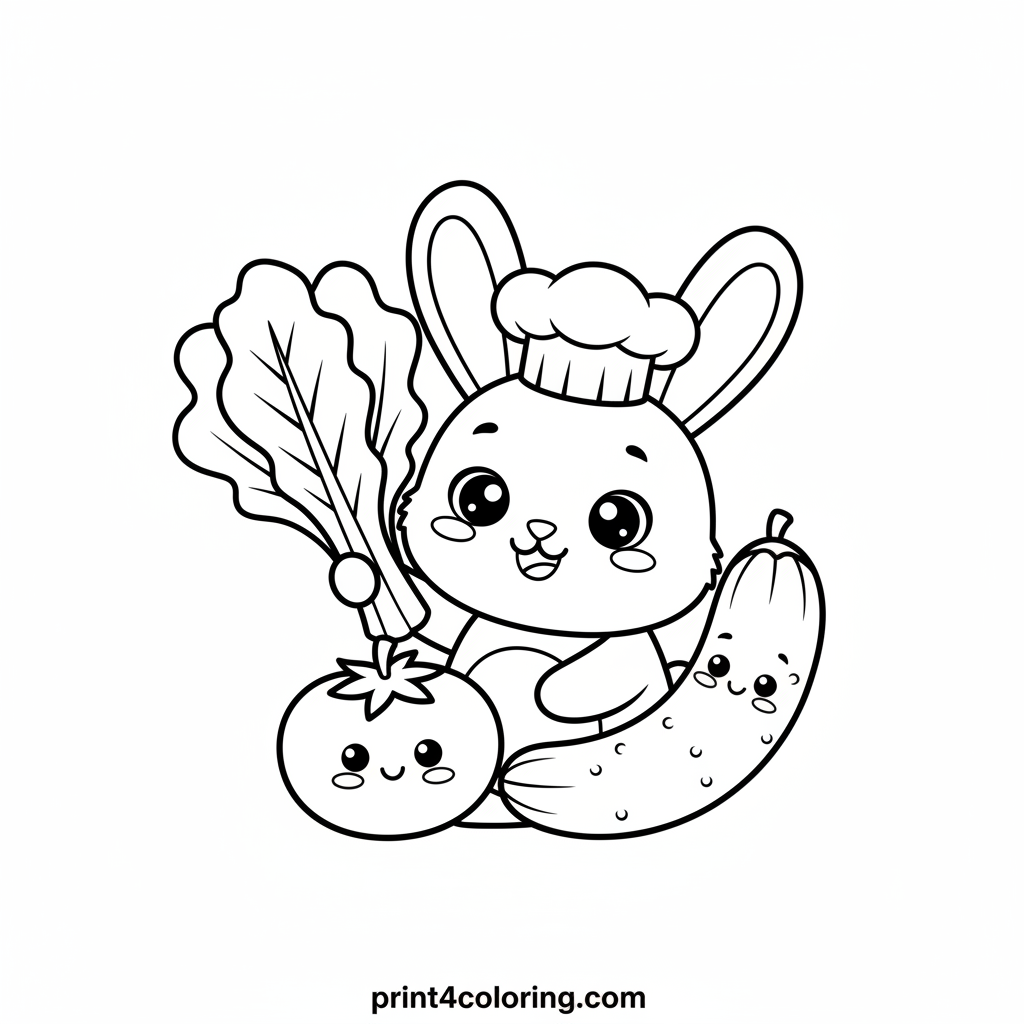 Join Chef Hoppy, a super cute bunny, as he proudly shows off his giant, fresh lettuce leaf! He's wearing his tiny chef's hat and surrounded by his happy garden friends like a smiling tomato and a cheerful cucumber. Get ready to add vibrant colors to this cozy harvest scene and make it deliciously bright!