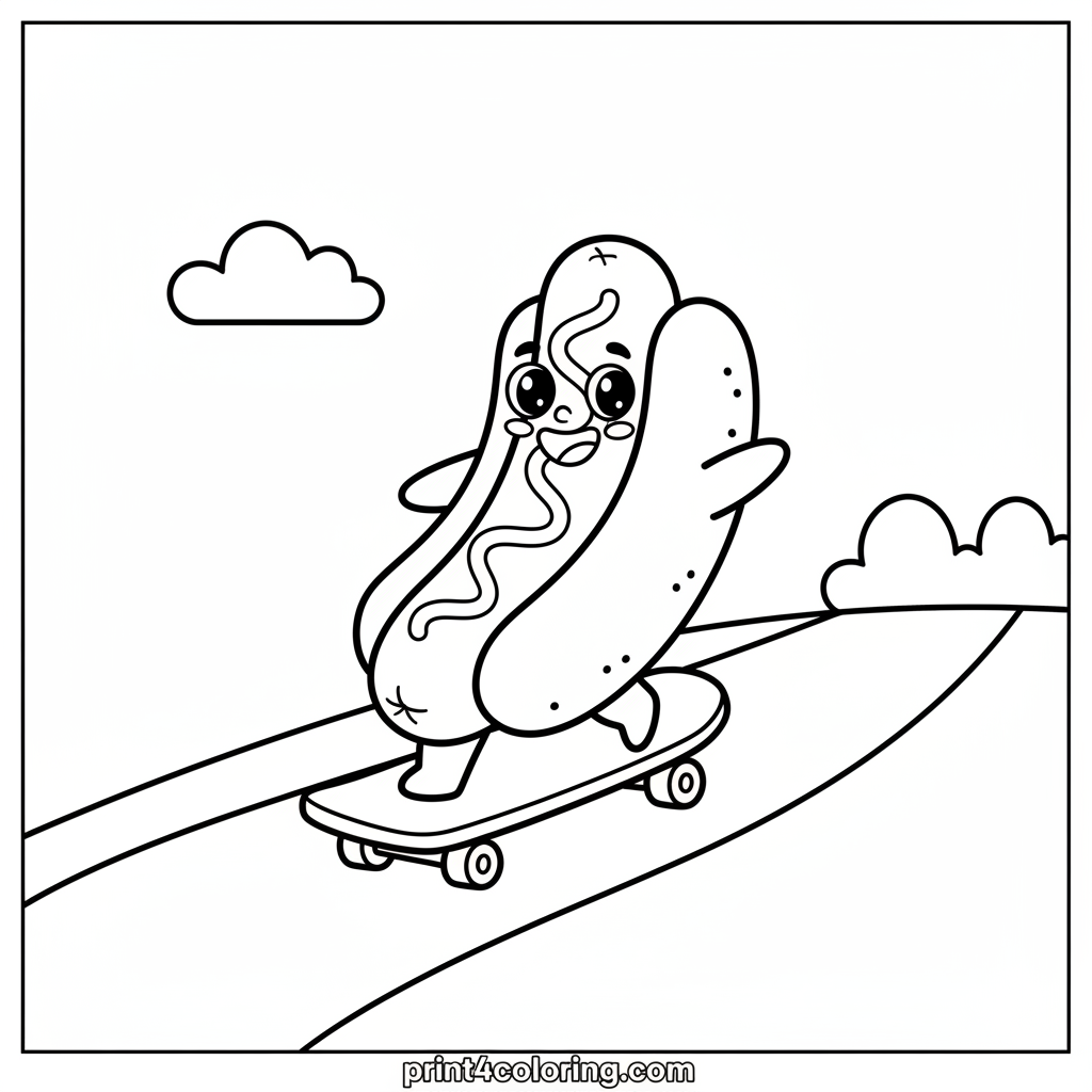 Join our cheerful hotdog friend as he zips and zooms on his awesome skateboard! With a big, friendly grin, he's ready for a fun adventure down the path. Grab your favorite crayons and bring this cool, cozy scene to life with vibrant colors. What a wheely good time!