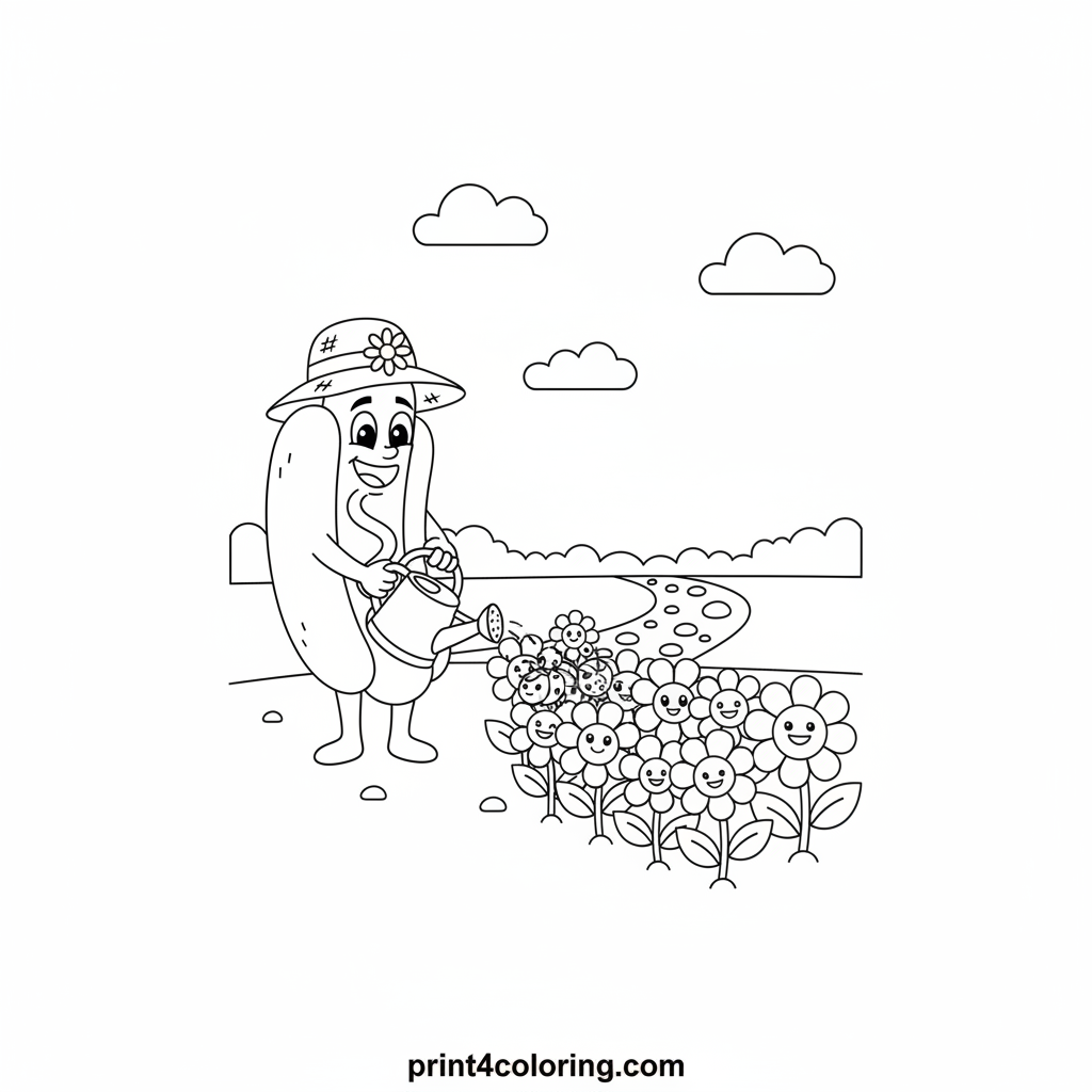 Join our cheerful hotdog friend on a sunny garden adventure! He's busy watering a row of happy, smiling flowers, helping them bloom beautifully. A tiny ladybug friend is nearby, enjoying the warmth. This delightful scene is perfect for young artists to bring to life with their favorite colors and imagination!