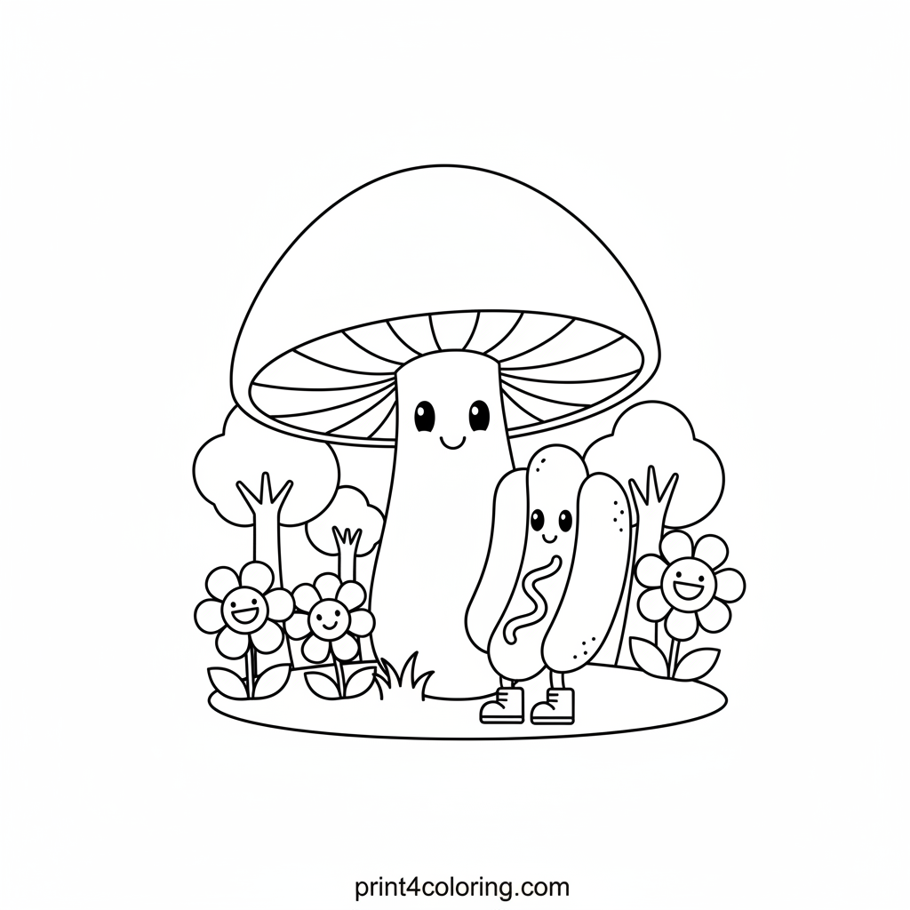 #hotdog#adventure#forest#mushroom#whimsical#magical#food-character#coloring-page#printable