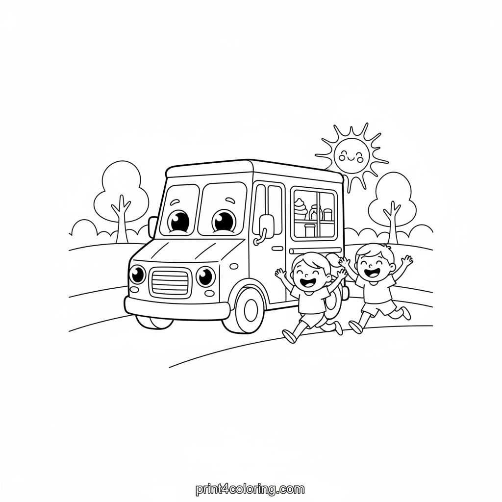 Get ready for a sweet adventure! This coloring page features a cute, smiling ice cream truck with big wheels, driving slowly through a sunny park. Two happy children are excitedly running alongside, waving their hands, eager for a delicious treat. Bring this joyful scene to life with your favorite colors!