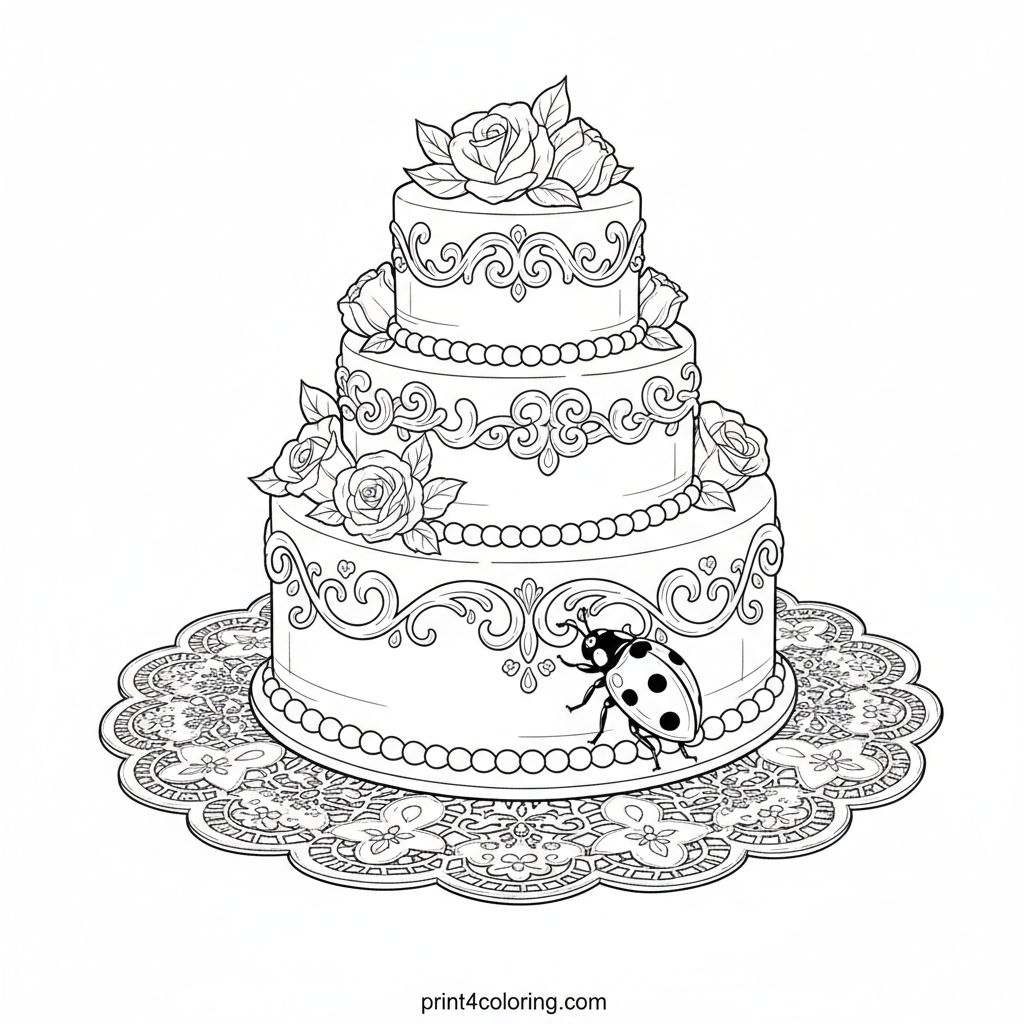 Dive into a delightful scene where a tiny ladybug embarks on a grand adventure! Discover a beautifully detailed miniature tiered cake, adorned with exquisite sugar flowers and intricate icing. Watch as our little friend carefully explores a sweet blossom, making this a charming and detailed page for expert colorists.