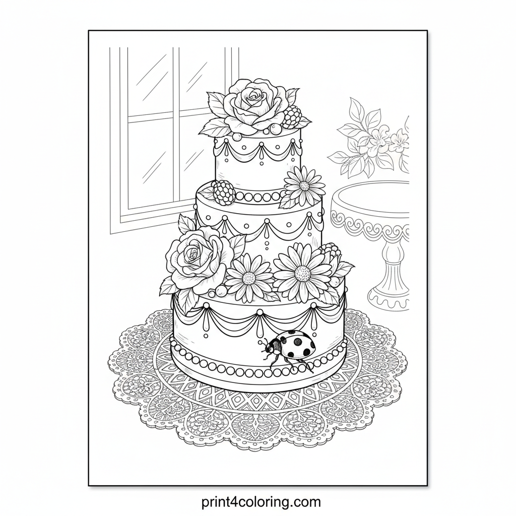 Embark on a miniature adventure! This intricate coloring page showcases a highly detailed tiered cake, complete with delicate edible flowers and exquisite icing patterns, resting on an antique lace doily. A curious ladybug carefully explores a sugar flower on the lowest tier, inviting you to bring this delightful, tiny world to vibrant life with your colors.
