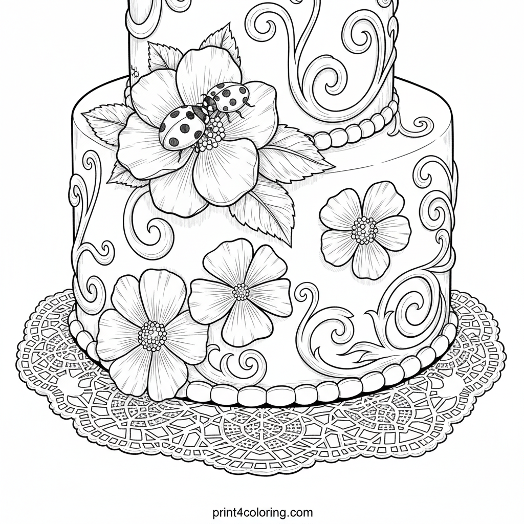 Join a tiny ladybug on an amazing adventure as it discovers a magnificent, miniature tiered cake! This expert-level coloring page features delicate edible flowers, intricate icing designs, and an antique lace doily. Can you bring this sweet, detailed scene to life with your most vibrant colors?