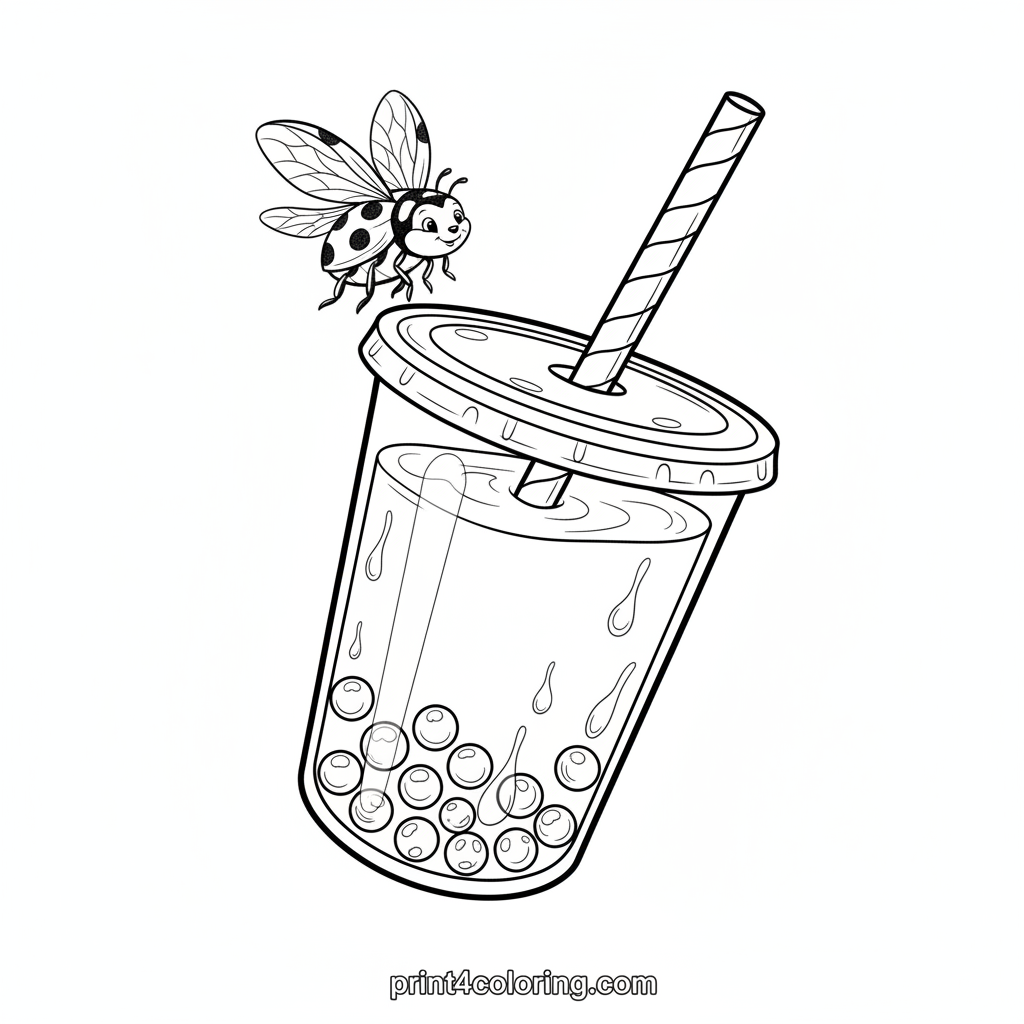 Dive into a delightful scene where a friendly ladybug has found the perfect perch! This meticulously detailed coloring page features a refreshing boba tea in a clear, frosted glass, complete with visible tapioca pearls and a wide straw. Intricate water droplets adorn the glass, making this a charming challenge.