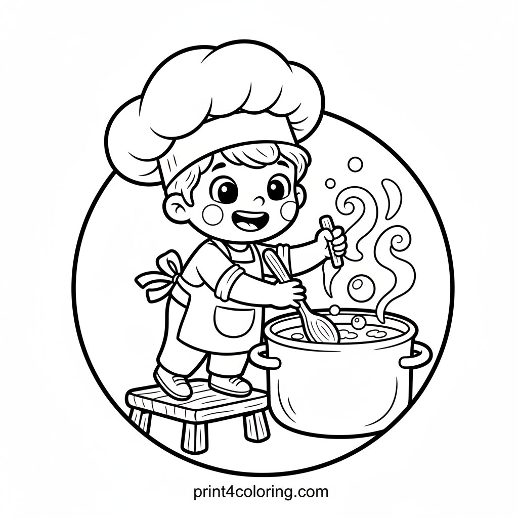 Our joyful little chef is busy stirring a steaming pot of super soup! Dressed in an oversized hat and apron, they stand on a stool, creating playful swirls and bubbles. This cozy kitchen scene is full of warmth and the fun of cooking. Grab your crayons and add vibrant colors to this heartwarming culinary adventure!