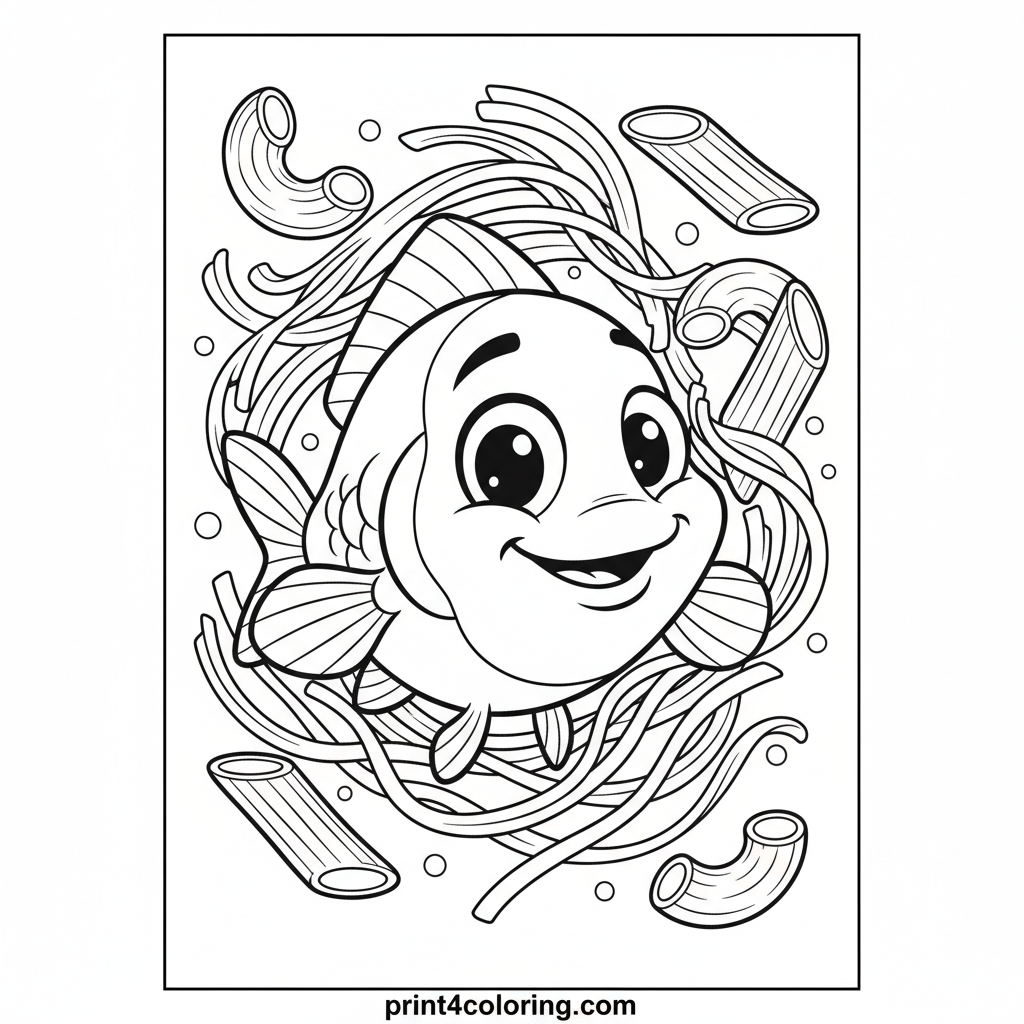 Dive into a delightful underwater world! A cheerful, wide-eyed fish explores a magical realm where giant, colorful macaroni twists form an exciting maze. Long, flowing fettuccine strands sway as seaweed, inviting you to add vibrant colors to this whimsical pasta paradise.