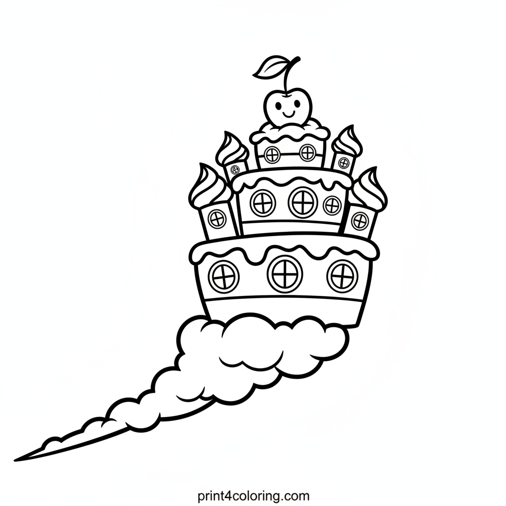 Embark on a sweet adventure with this whimsical coloring page! Discover a delightful castle made entirely of delicious cake, adorned with fluffy frosting turrets, vibrant candy windows, and a perfect cherry on top. This enchanting scene floats gently on a soft, puffy cloud, inviting you to bring its magical charm to life with your favorite colors.