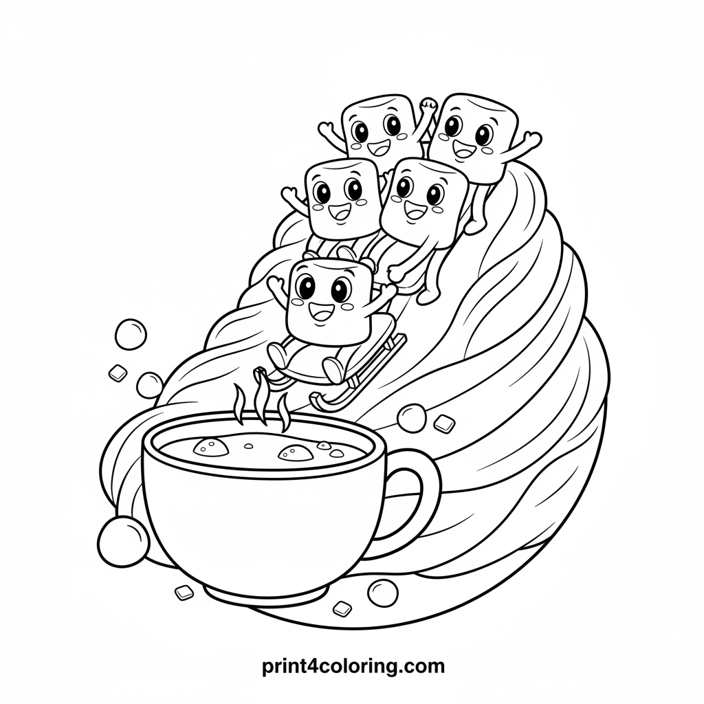 Join a delightful adventure as cute, smiling marshmallows with tiny limbs joyfully sled down a towering mountain of fluffy whipped cream! Their sweet journey is destined for a warm, inviting mug of hot chocolate below. This cozy scene promises an adorable and tasty coloring experience for all ages.