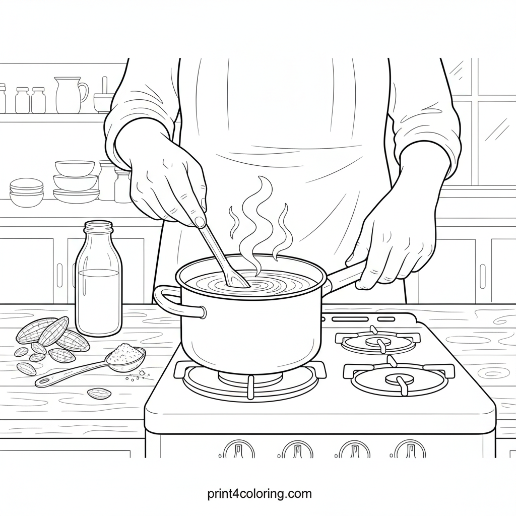 Immerse yourself in a cozy kitchen moment! Skilled hands carefully stir rich hot chocolate in an enamel saucepan on a vintage stove, steam rising gently. In the background, cocoa beans, a measuring spoon, and fresh milk await. This detailed scene invites you to color every delicious step of crafting a perfect, warm cocoa treat.