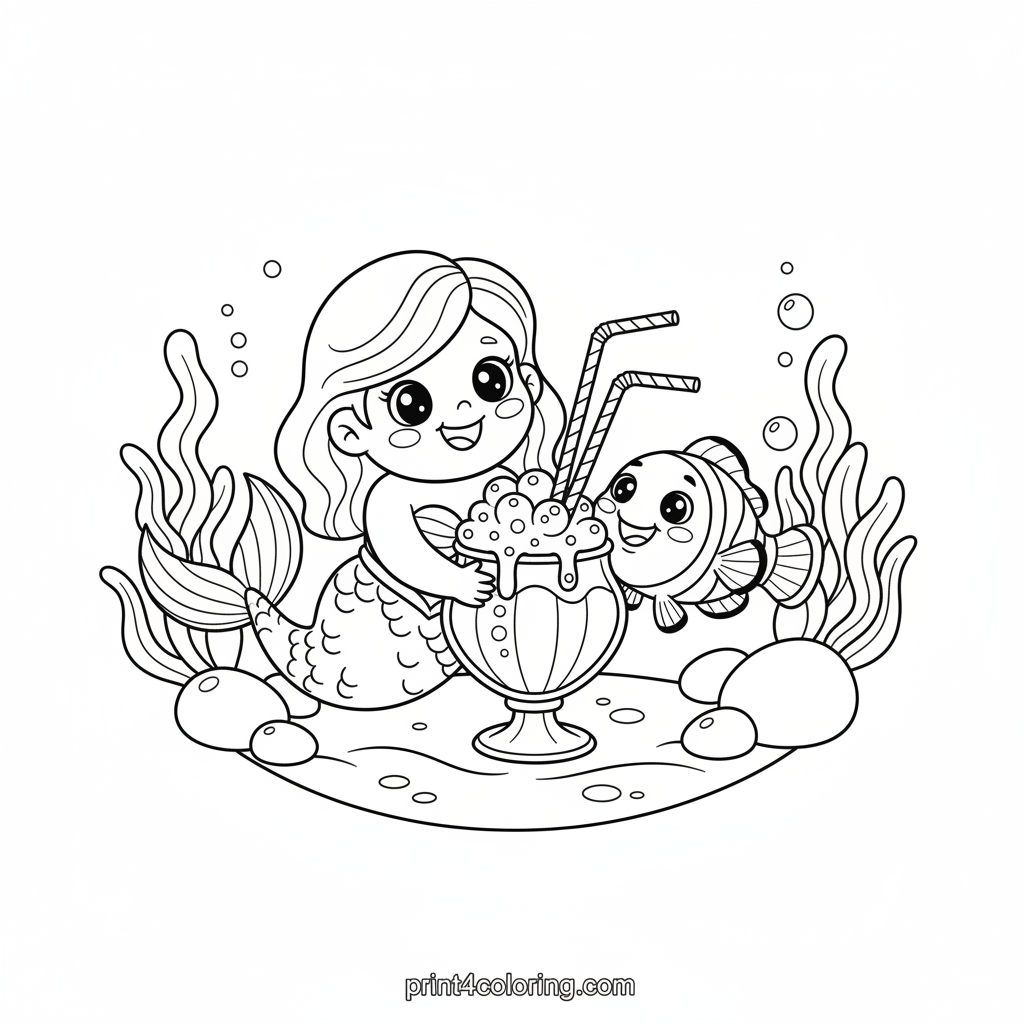 Dive into a delightful underwater scene! A friendly mermaid and her happy clownfish pal are enjoying a giant, bubbly milkshake with extra-long straws. Gentle seaweed sways, creating a cozy and sweet moment. Grab your colors and bring this magical ocean party to life!
