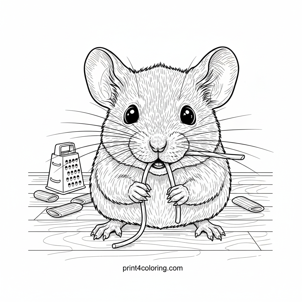 Color a delightful close-up of a tiny, friendly field mouse, with realistic fur and bright, curious eyes, carefully balancing a single spaghetti strand for a miniature feast. In the background, discover a charming kitchen corner featuring a tiny cheese grater and scattered penne pasta pieces.