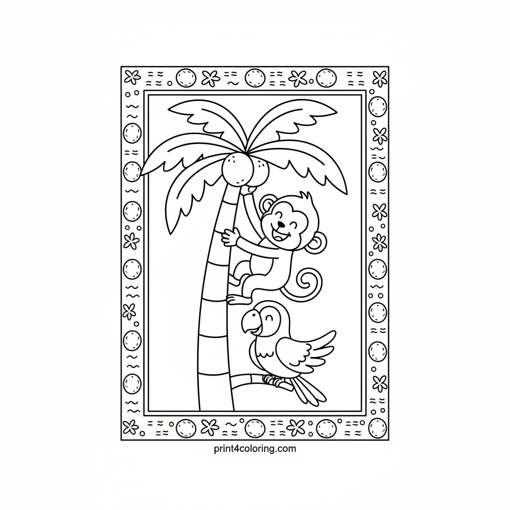 Join a playful monkey on an exciting adventure as he climbs a tall palm tree, eager to grab a delicious coconut! Below, a colorful parrot watches with a happy chirp. This scene is framed with a fun pattern, inviting you to add vibrant colors to the tropical leaves and curious creatures. Get ready for some jungle fun!