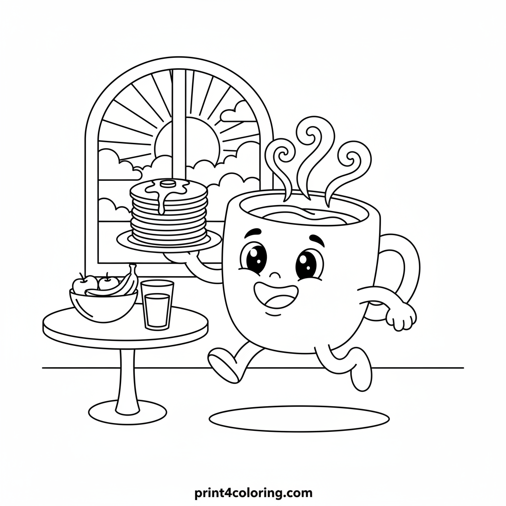 #coffee-mug#pancakes#breakfast#whimsical#food#cartoon#adventure#kitchen#morning#coloring-page#printable