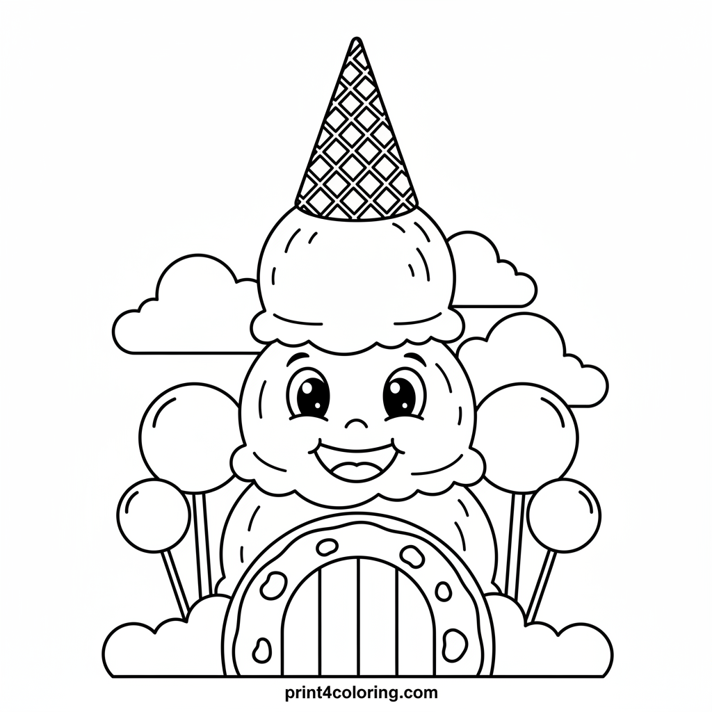 Step into a world of pure imagination with this delicious coloring page! Explore a magnificent castle built from towering scoops of ice cream, topped with crunchy waffle cone turrets. Fluffy whipped cream clouds drift by, and candy trees dot the magical landscape. Get ready to color a sugary wonderland!