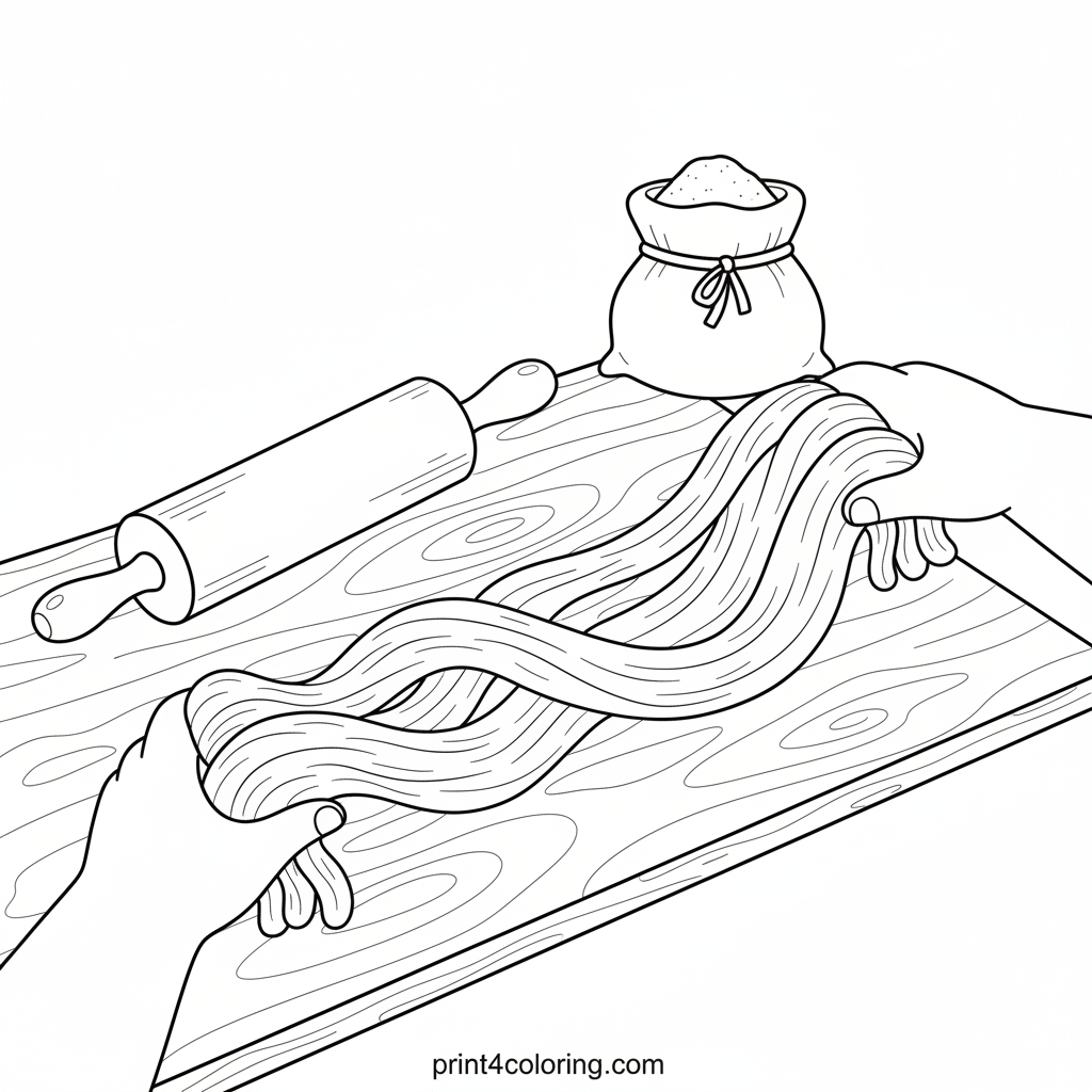 Dive into the cozy world of noodle making! This page beautifully captures a pair of expert hands skillfully stretching and folding dough into long, delicious noodles. Observe the amazing elasticity and texture of the dough, set against a warm, floured wooden surface. A perfect scene for aspiring chefs and artists alike!