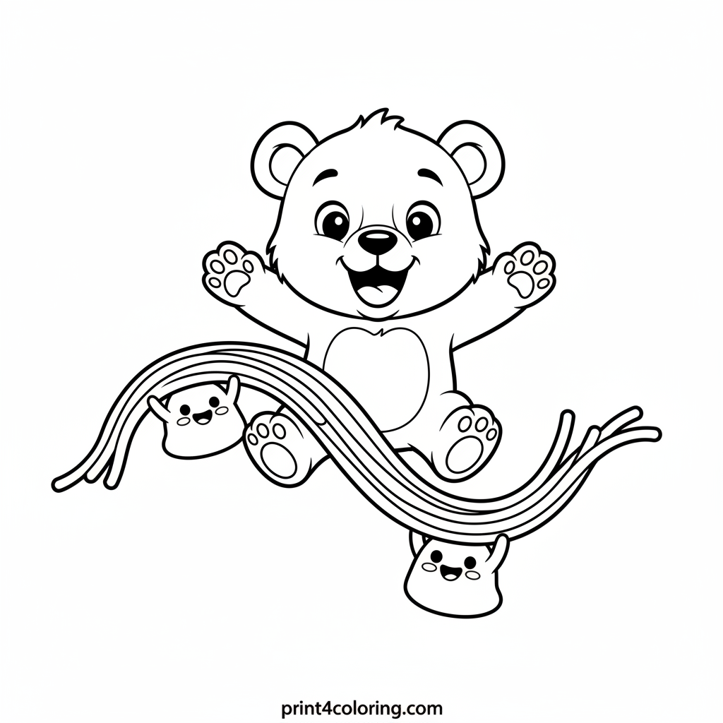 Get ready for some silly fun! This coloring page features a cheerful bear cub, full of energy, leaping over a super long, wavy spaghetti noodle. Two friendly, blob-like noodle pals hold the ends, cheering on our nimble jumper. A delightful scene perfect for little artists to bring to life with vibrant colors!