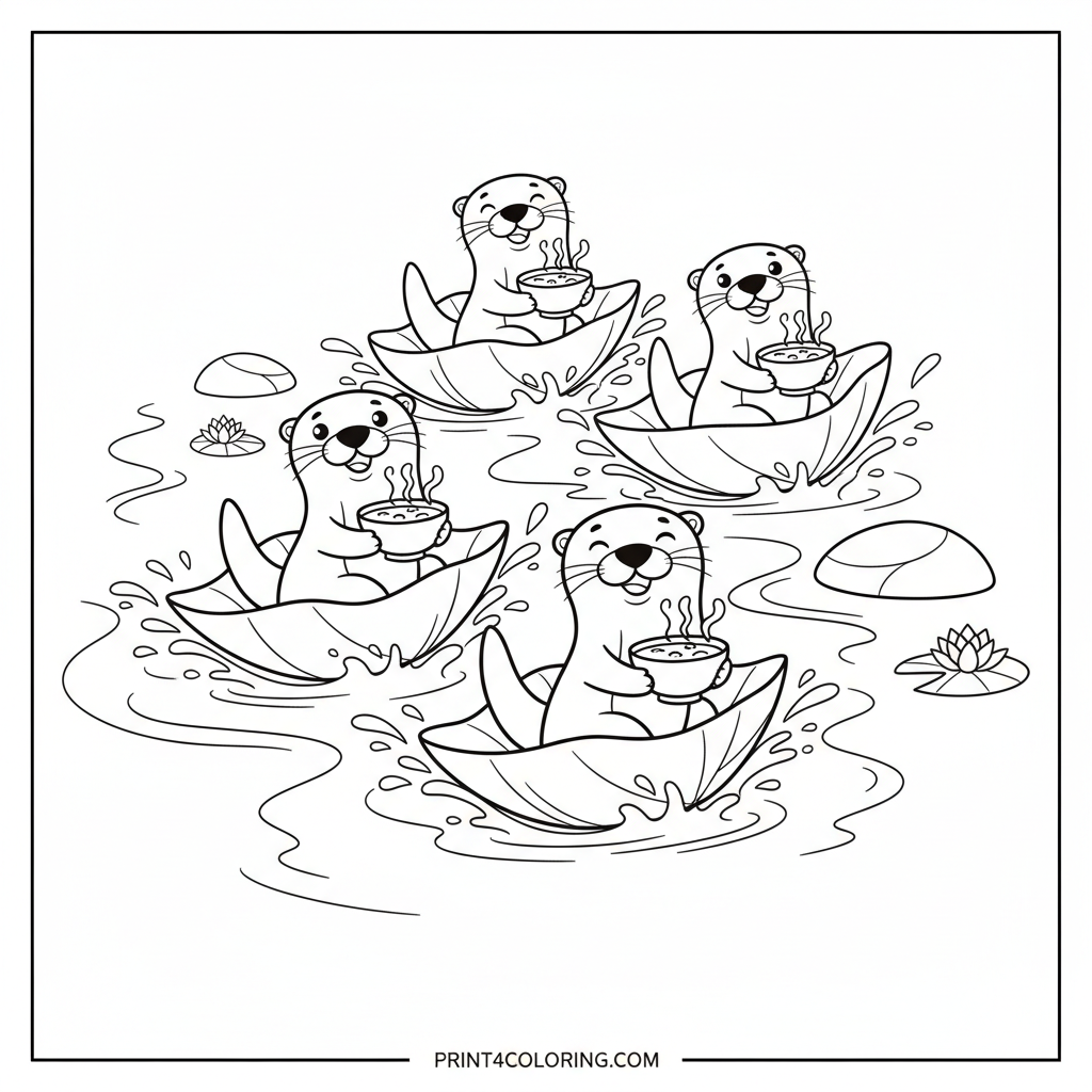 Dive into a world of fun with three speedy otters! Watch them grin and splash as they race across a sparkling pond in their tiny leaf boats, each carefully balancing a yummy bowl of soup. This playful scene is brimming with action and smiles, just waiting for your vibrant colors to bring it to life!