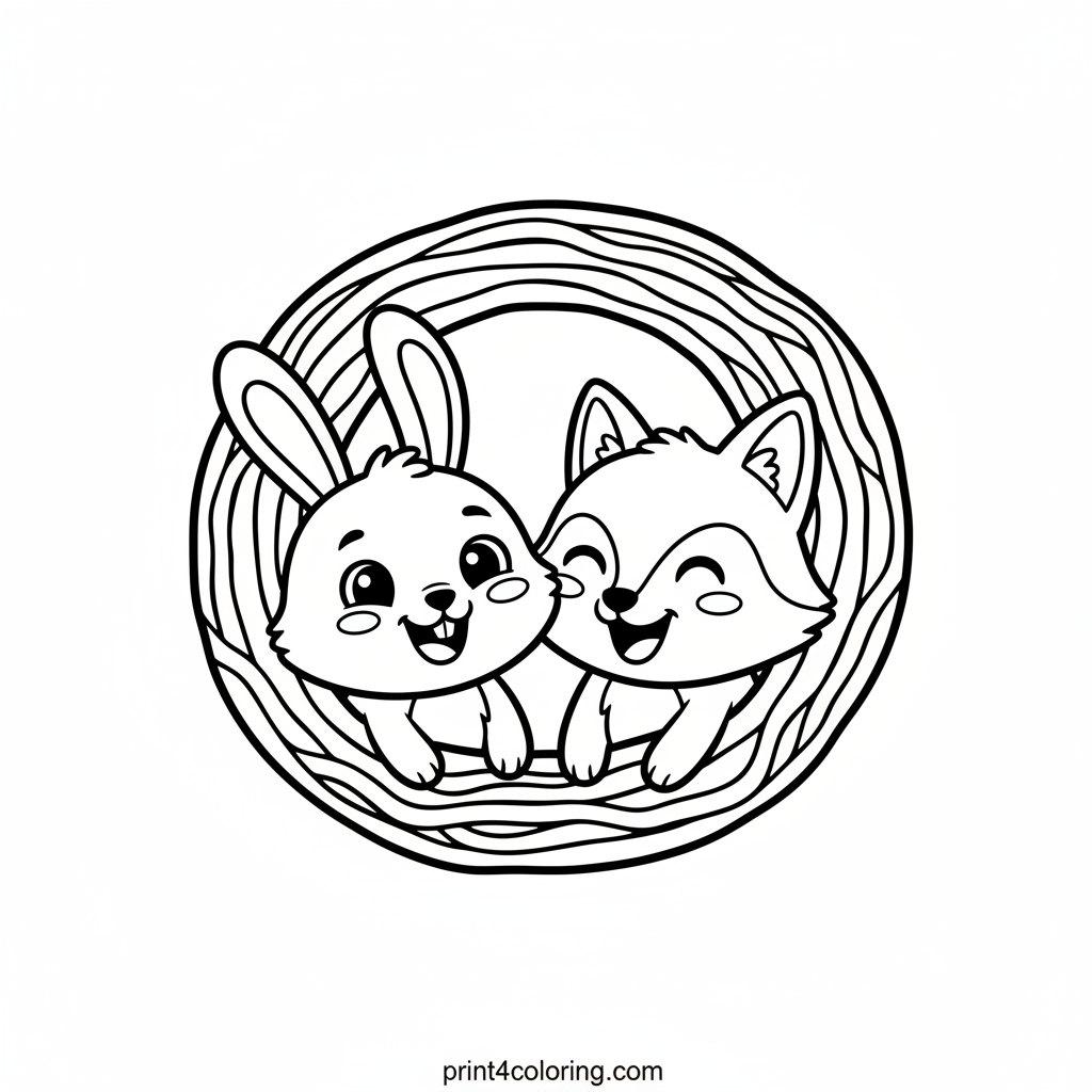 Dive into a world of giggles with this enchanting coloring page! A giant, curly rainbow noodle serves as the most magical slide ever. Watch as a playful bunny and a cheerful fox zoom down, their faces filled with pure joy. This whimsical scene invites you to add vibrant colors to their extraordinary playground adventure.