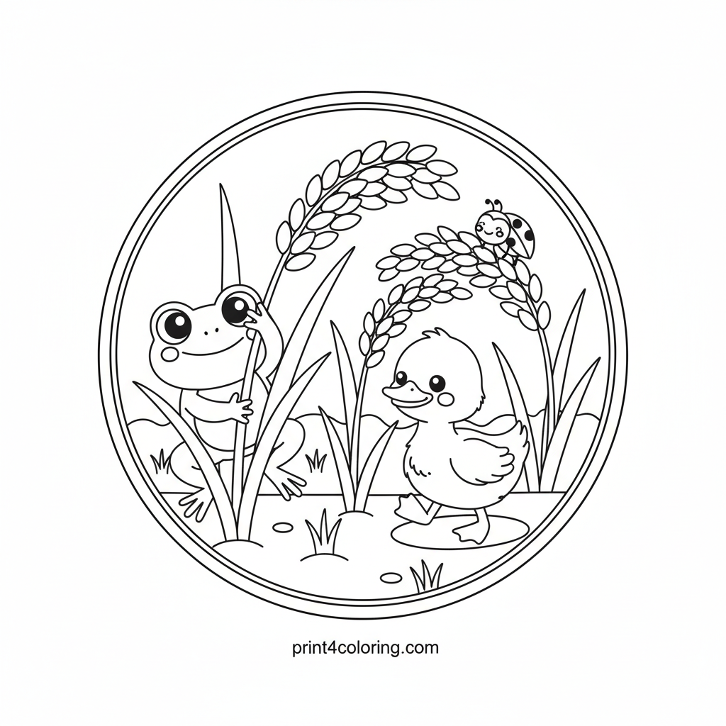 Hop, waddle, and crawl into a world of fun! Join a playful frog, a happy duckling, and a tiny ladybug as they enjoy a game of hide-and-seek among the tall, green rice stalks. This adorable scene captures the joy of friendship in a cozy, sun-kissed rice paddy, perfect for little hands to bring to life with color.