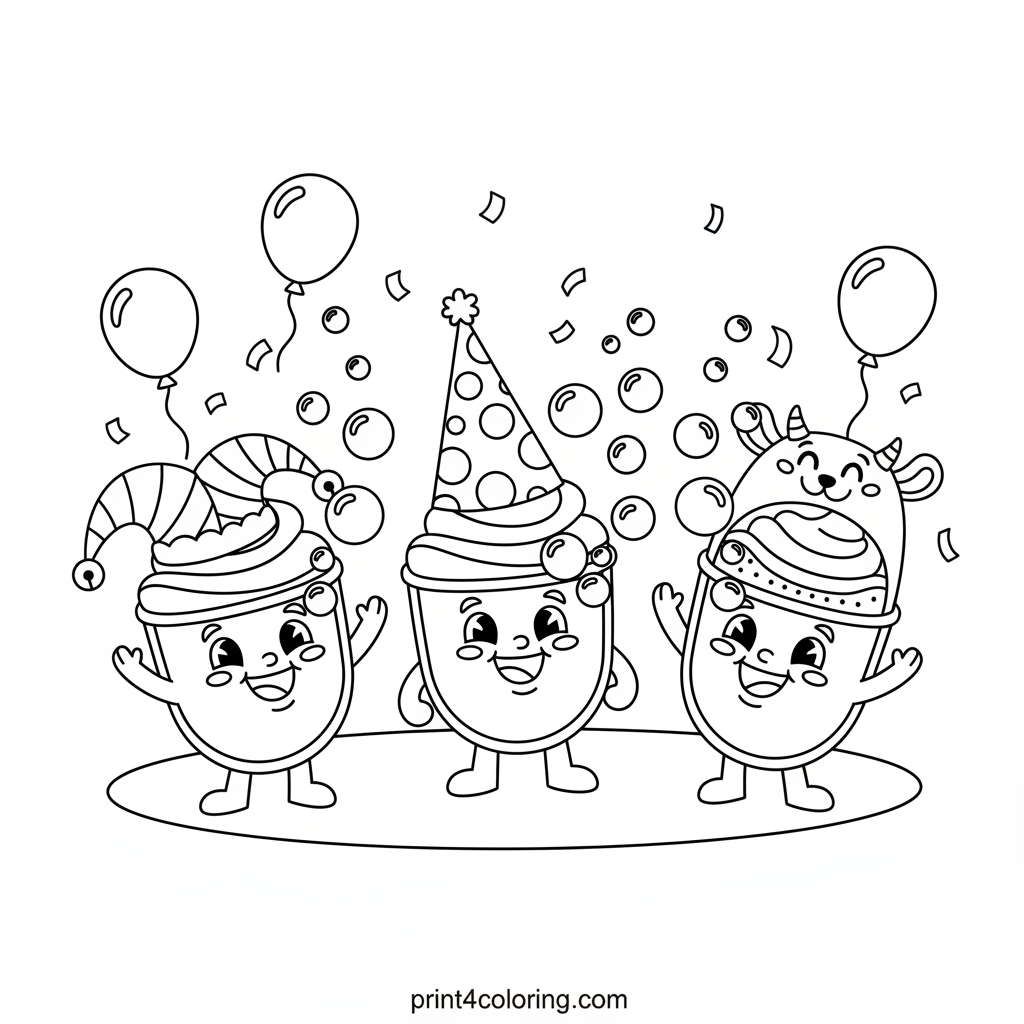 It's a super silly hat party! Three delicious milkshakes—chocolate, vanilla, and strawberry—are wearing their funniest, oversized party hats. They're happily blowing shimmering bubbles for everyone to enjoy. Grab your crayons and add vibrant colors to this sweet celebration, making their joyful scene pop!