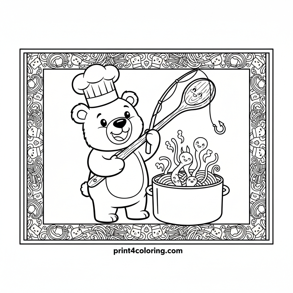 Silly Noodle Fishing Bear Chef Coloring Page