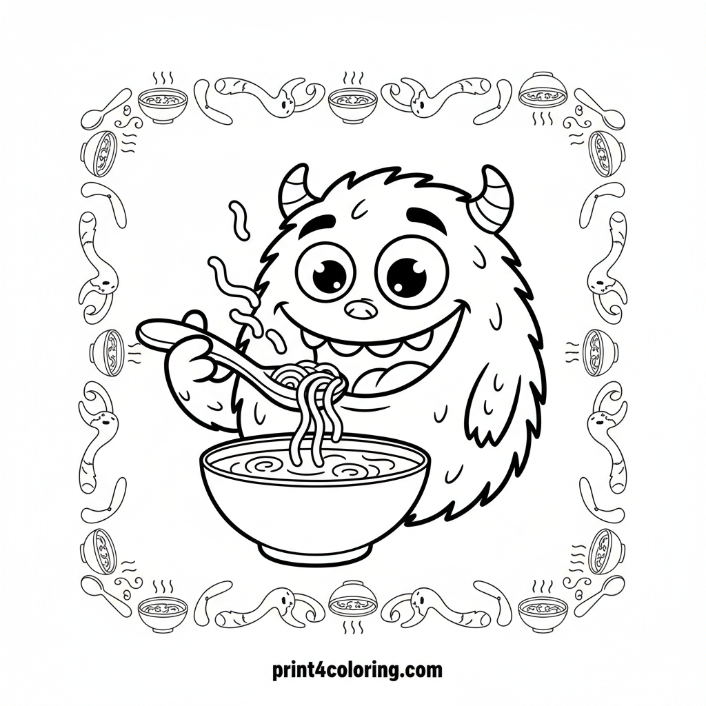 Meet our adorable, fuzzy monster friend with the biggest, goofiest eyes! This round, happy creature is having a blast slurping a giant bowl of delicious soup with its extra-long spoon. Watch out for the playful noodles flying around as it giggles and slurps! A super fun scene perfect for little artists.