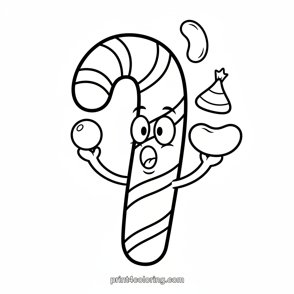 Prepare for a sweet giggle! This wobbly candy cane has a surprised expression as it attempts to juggle a gumdrop, chocolate kiss, and jelly bean. Oops, one candy is comically falling right off its head! Grab your brightest colors and bring this funny, sugary scene to life. It's a delightful challenge for young artists!